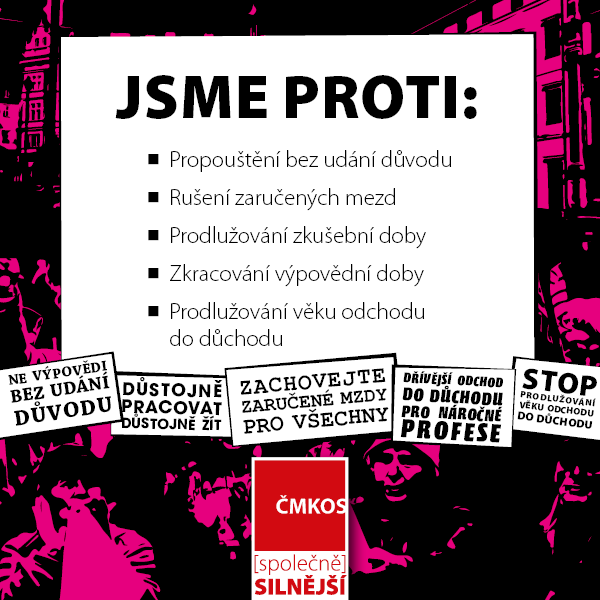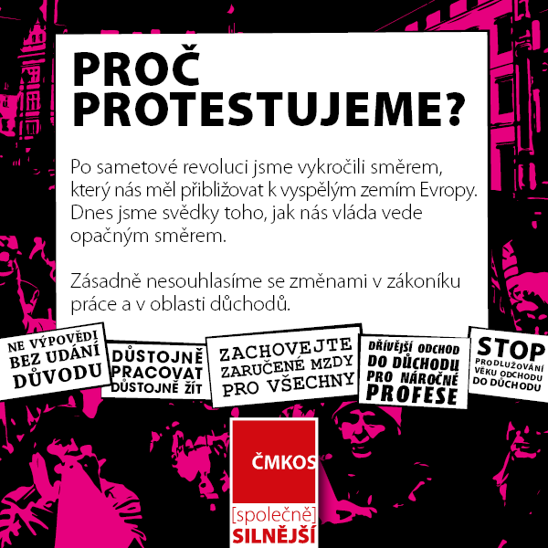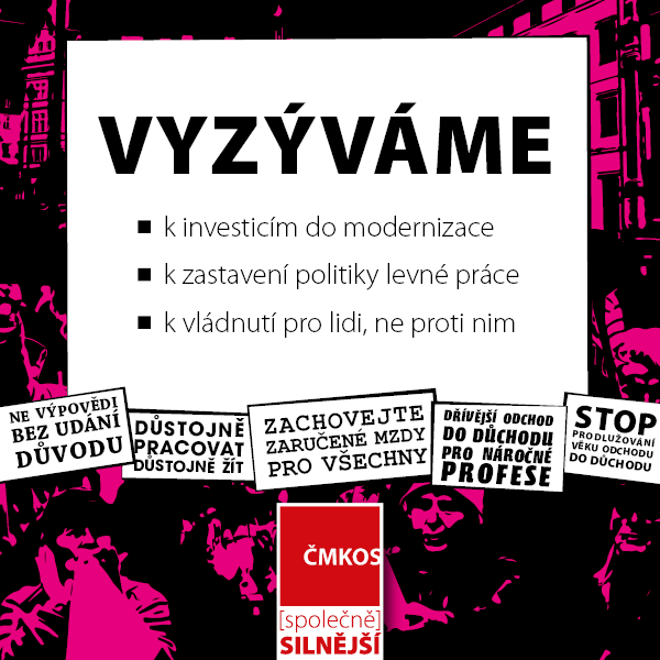 Nastal čas se ozvat. Právě teď můžeme společně ovlivnit směřování naší pracovní budoucnosti, našich mezd, platů, důchodů, a tím i našeho celkového životního standardu. Jak dobře víte, vláda připravuje změny, které nepřijatelným způsobem zhorší situaci zaměstnanců*kyň a důchodců*kyň. Musíme dát důrazně najevo, že s tím nesouhlasíme. Spojme síly a staňme se hlasem, který se nedá přeslechnout.