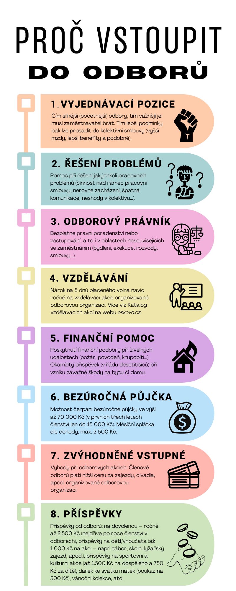 Odbory jsou tady pro to, že znají legislativu, dokážou přispívat ke zlepšení komunikace mezi zaměstnavatelem a zaměstnanci, k dosažení dobré firemní kultury a příjemné pracovní atmosféry. Umí předcházet, případně řešit následky negativních jevů jako je mobbing, bossing, diskriminace a šikana v práci.